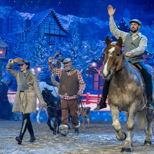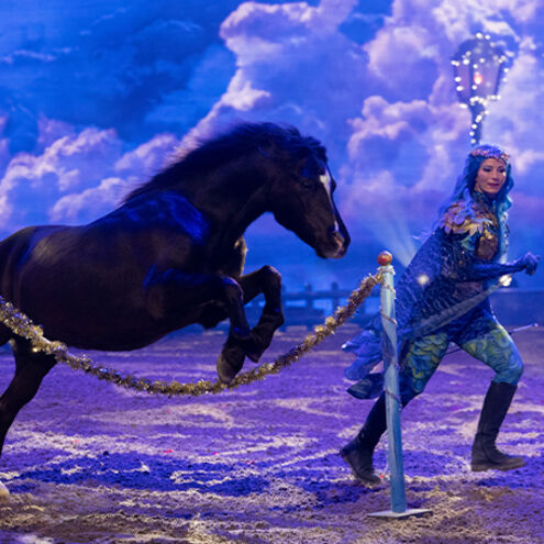 Of course, our beautiful CAVALLUNA horses are on board again for this show - whether cuddly ponies, elegant Lusitanos or proud freedom horses. Spectacular fire effects, action-packed stunts and wonderful magical scenes perfectly round off the wintry programme. The experienced team of the popular European tour of CAVALLUNA provides rousing music, a great stage set and colourful costumes. And last but not least, of course, extraordinarily talented actors enchant the audience, bringing the characters to life with lots of wit and comedy and telling an exciting and heart-warming story in "WinterWünscheLand".