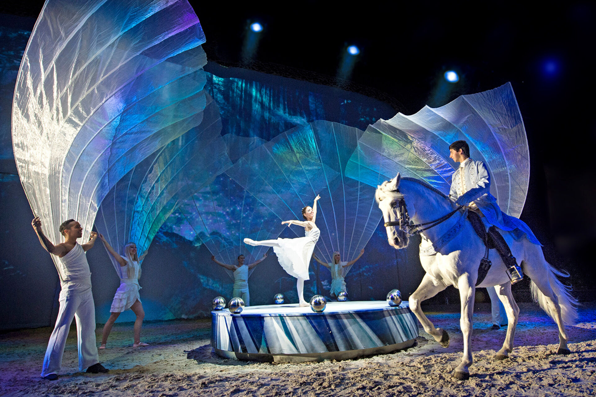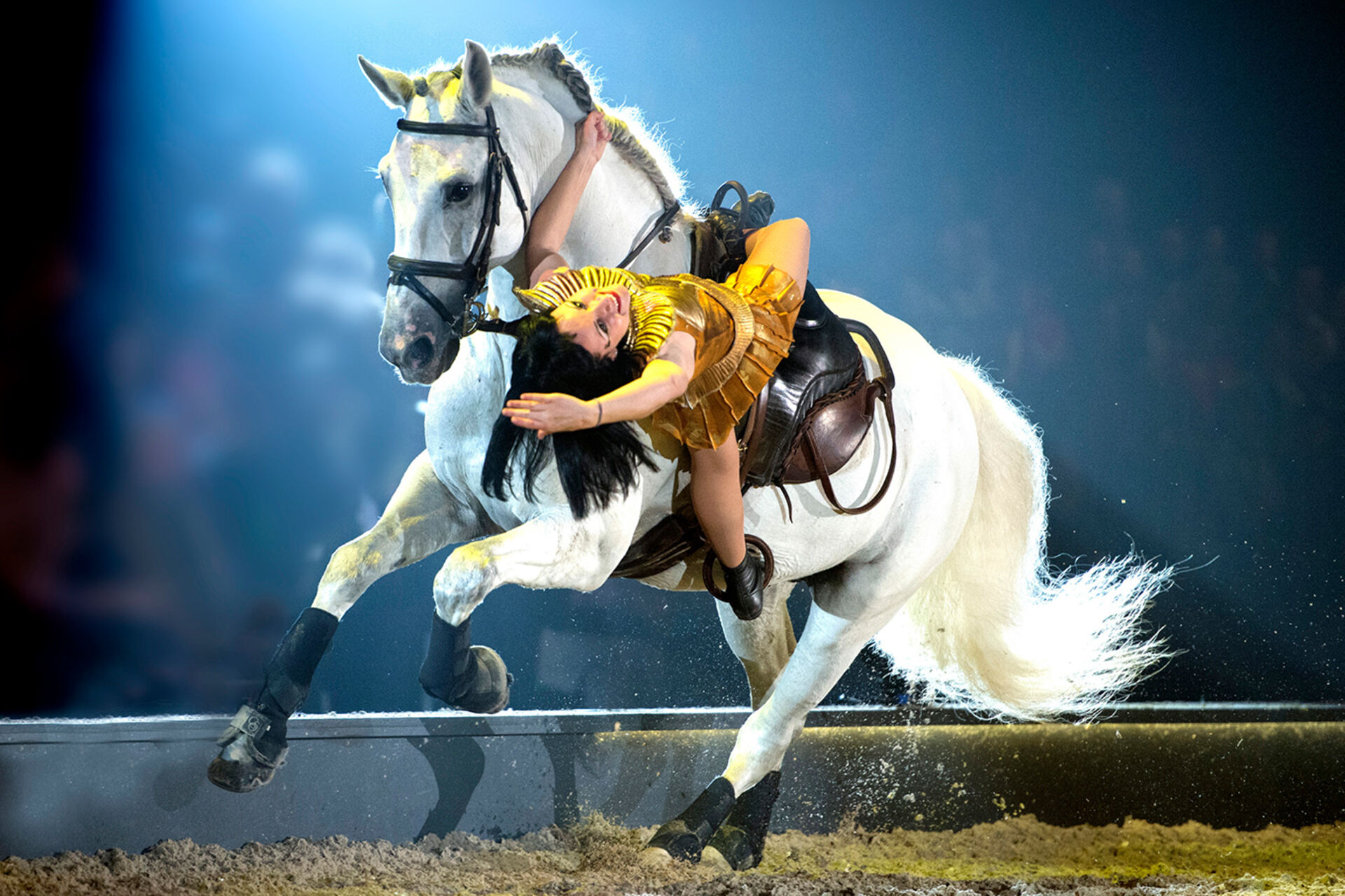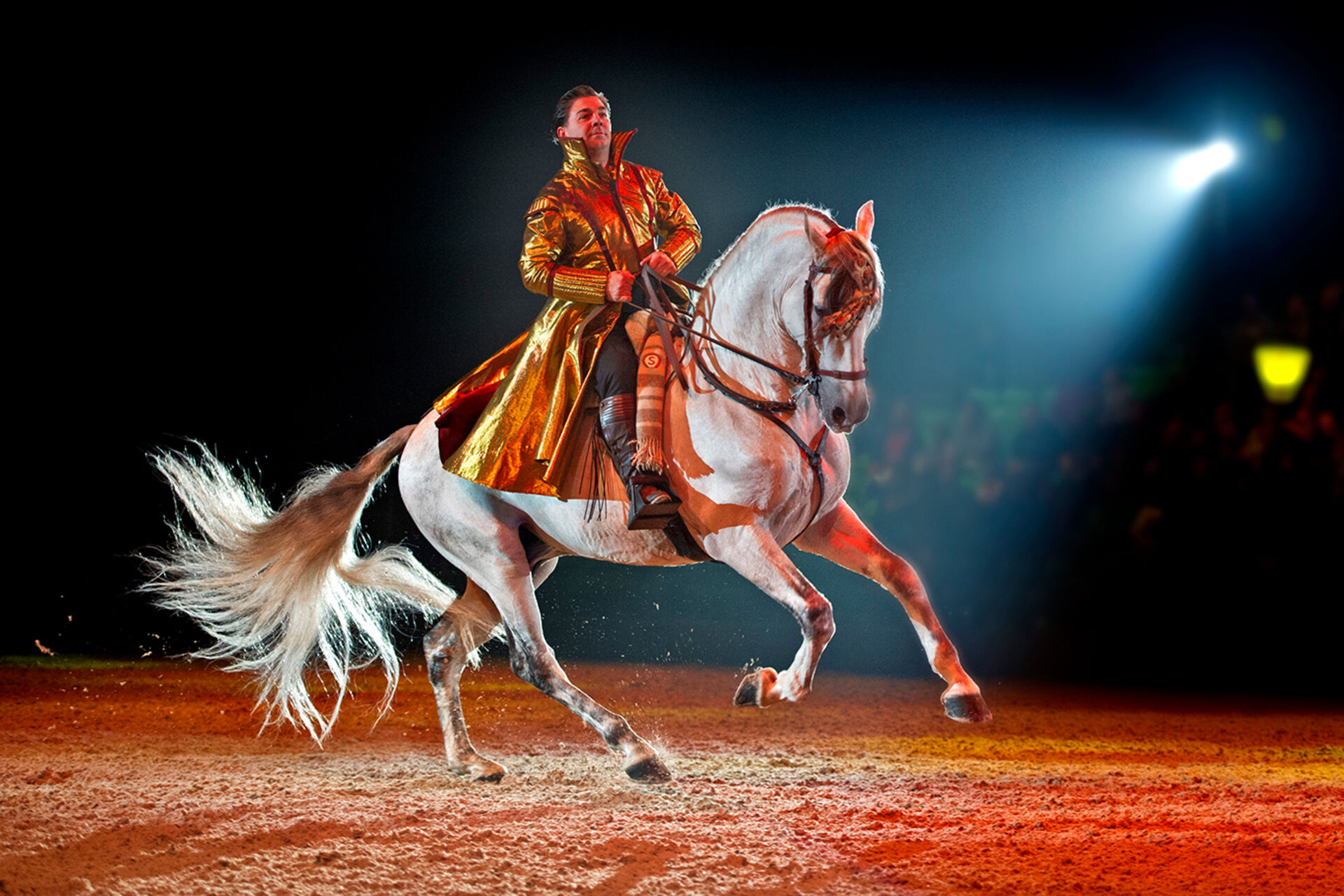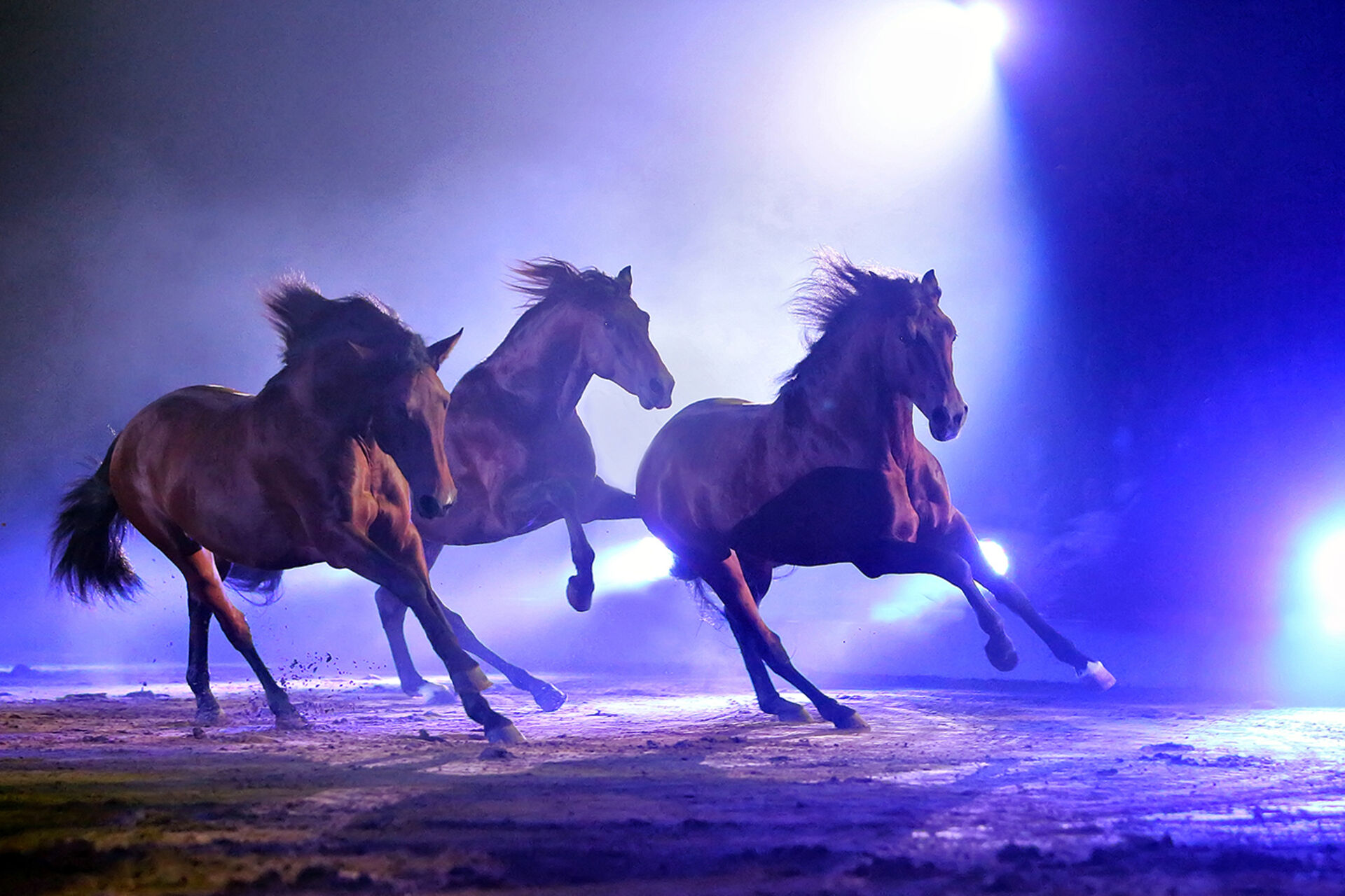 Be enchanted by magnificent scenes, sophisticated choreography and, of course, one thing above all else: almost 60 beautiful horses. The best and most famous riding teams from all over Europe will demonstrate their skills and versatility in a wide variety of equestrian disciplines. Look forward to fiery Andalusians from Spain, breathtaking trick riders from France and elegant black Friesians from Germany. Deeply moving liberty numbers, a spectacular Hungarian Post and cheeky mini ponies are also a must. Their thrilling performances are rounded off by a highly talented international dance company and spectacular special effects – an adventurous journey for the senses is guaranteed!