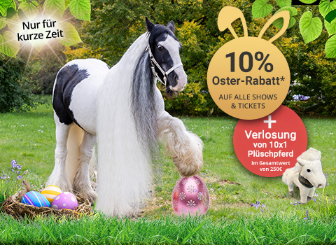 Lösen Sie den Rabatt-Code "ostern10" bis zum 06. April 2026 in unserem Ticketshop ein und nehmen Sie automatisch an der Verlosung teil. Unter allen Teilnehmenden verlosen wir 10x1 Plüschpferd im Gesamtwert von 250 Euro.
